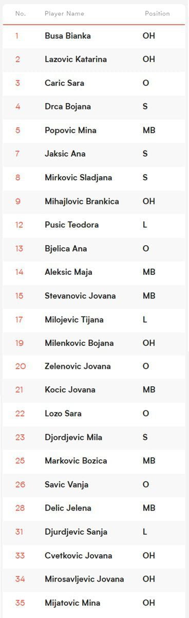 İtalyan çalıştırıcı Daniele Santarelli’nin başantrenörlüğünü yaptığı Sırbistan’ın 2022 FIVB Milletler Ligi geniş kadrosu şöyle: